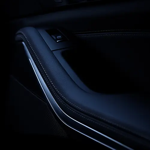Lederkaschierte Türverkleidung mit farblich abgesetzter Ziernaht und verchromtem Türöffner.