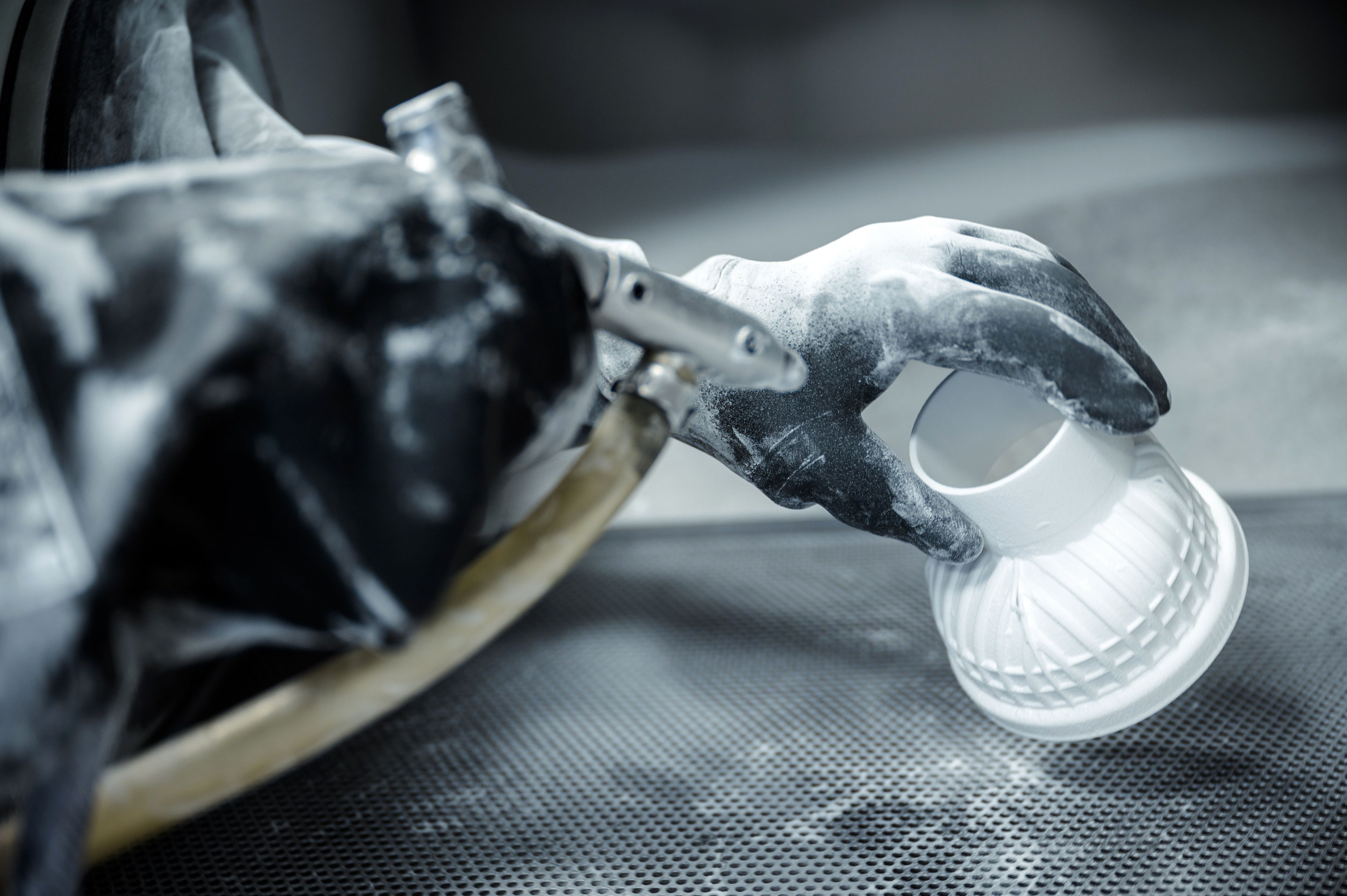 Reinigung des SLS-Bauteils nach Entnahme aus dem Pulverbett.