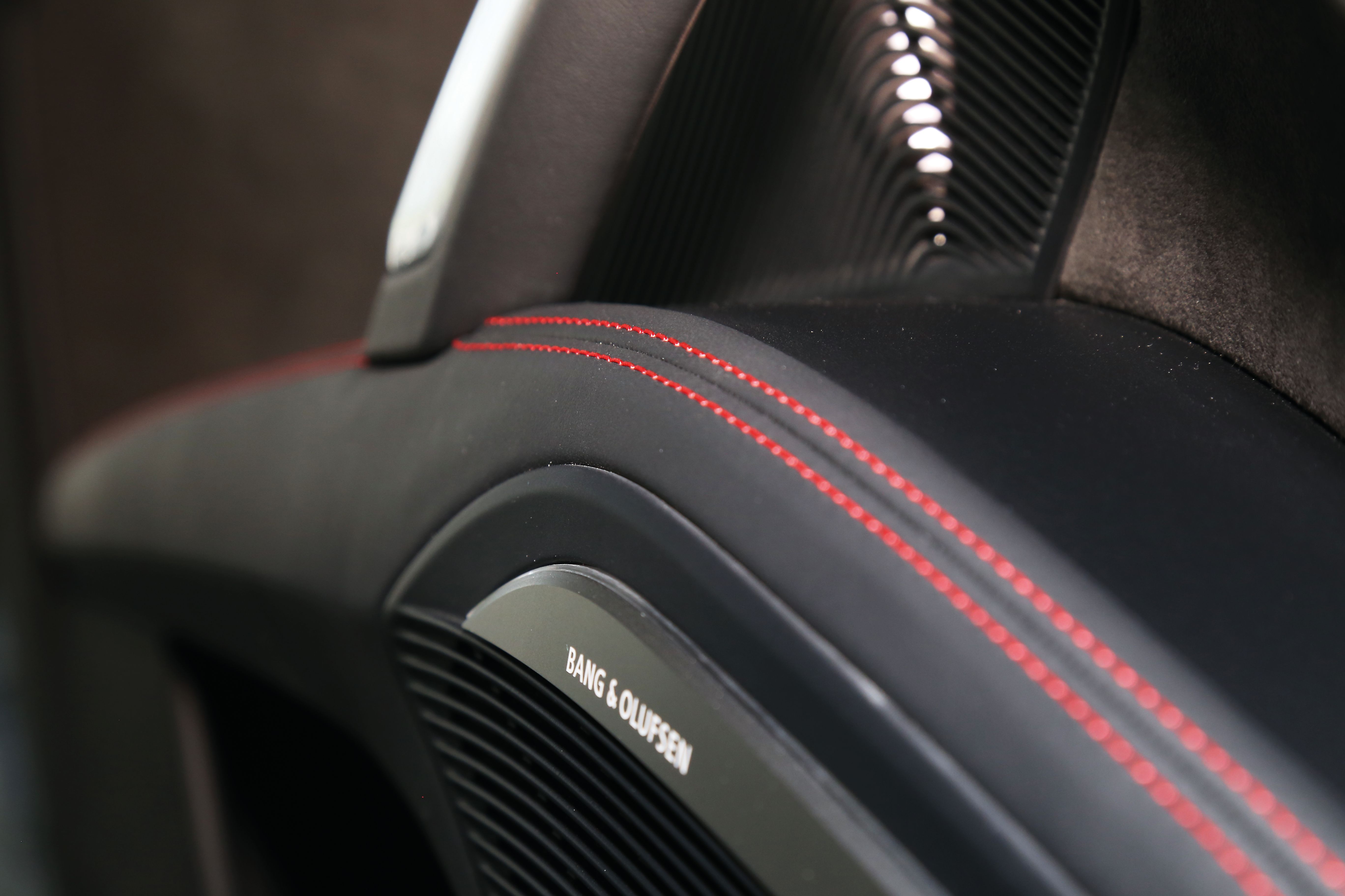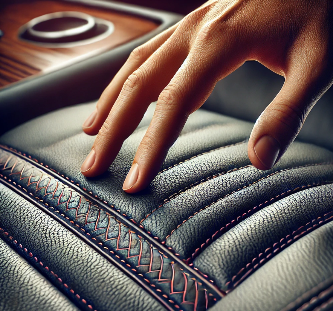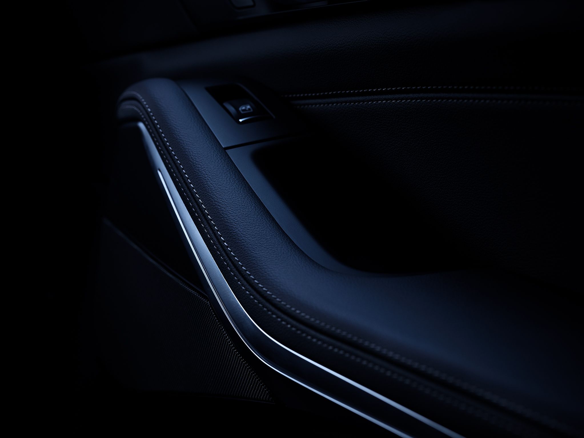 Leather-laminated door panel with contrasting decorative stitching and chrome-plated handle.