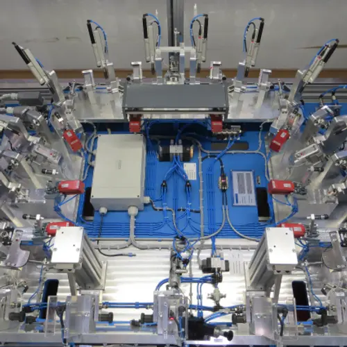 Pneumatic/sensor-controlled test jig for 100% monitoring in series operation.